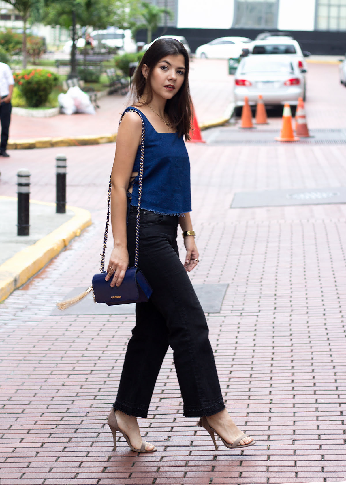 Mi look, en este outfit usé un top originalmente denim azul, el pantalon que también se considera una pieza de mezclilla pero en este caso de color negro, ambos de Zara. Aceptando las botas anchas por mucho que me costara, pero no puedo negar que me encanta como lucen y el estilismo que le da a nuestro cuerpo, definitivamente, me quedo con ellas. Sandalias nude y completo el look con cartera azul marino de Steve Madden que conseguí en super descuento y la amé, y va perfecto con el denim!